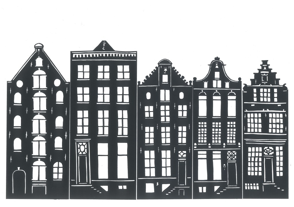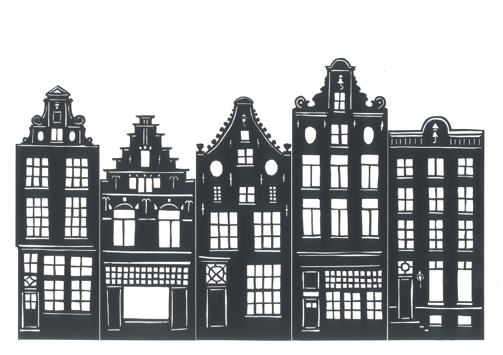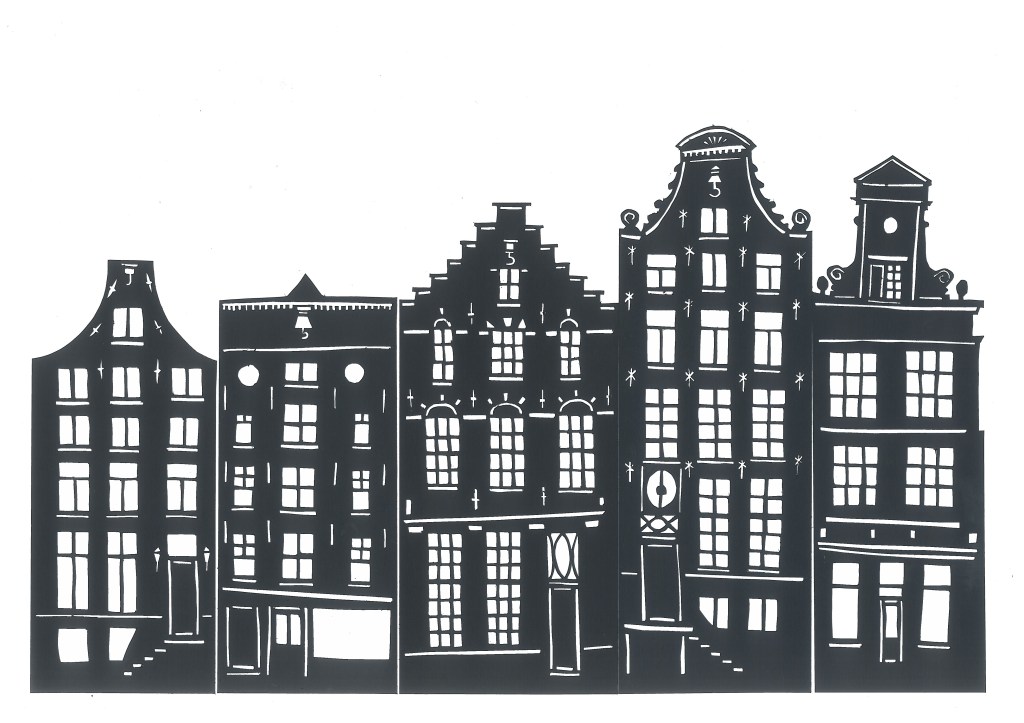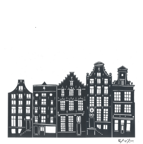 I stared making papercuts of the Amsterdam architecture back in 2008 when I received a craft knife with a swivel blade as a gift. I start with a single sheet of black paper and cut out the design with the tiny knife. In the pieces below, I chose different buildings from various places in the city and brought them together to make a new scene. I tired to include all the varying gable styles from different periods of the city’s history that are proudly displayed along Amsterdam’s seemingly endless rows of canals.